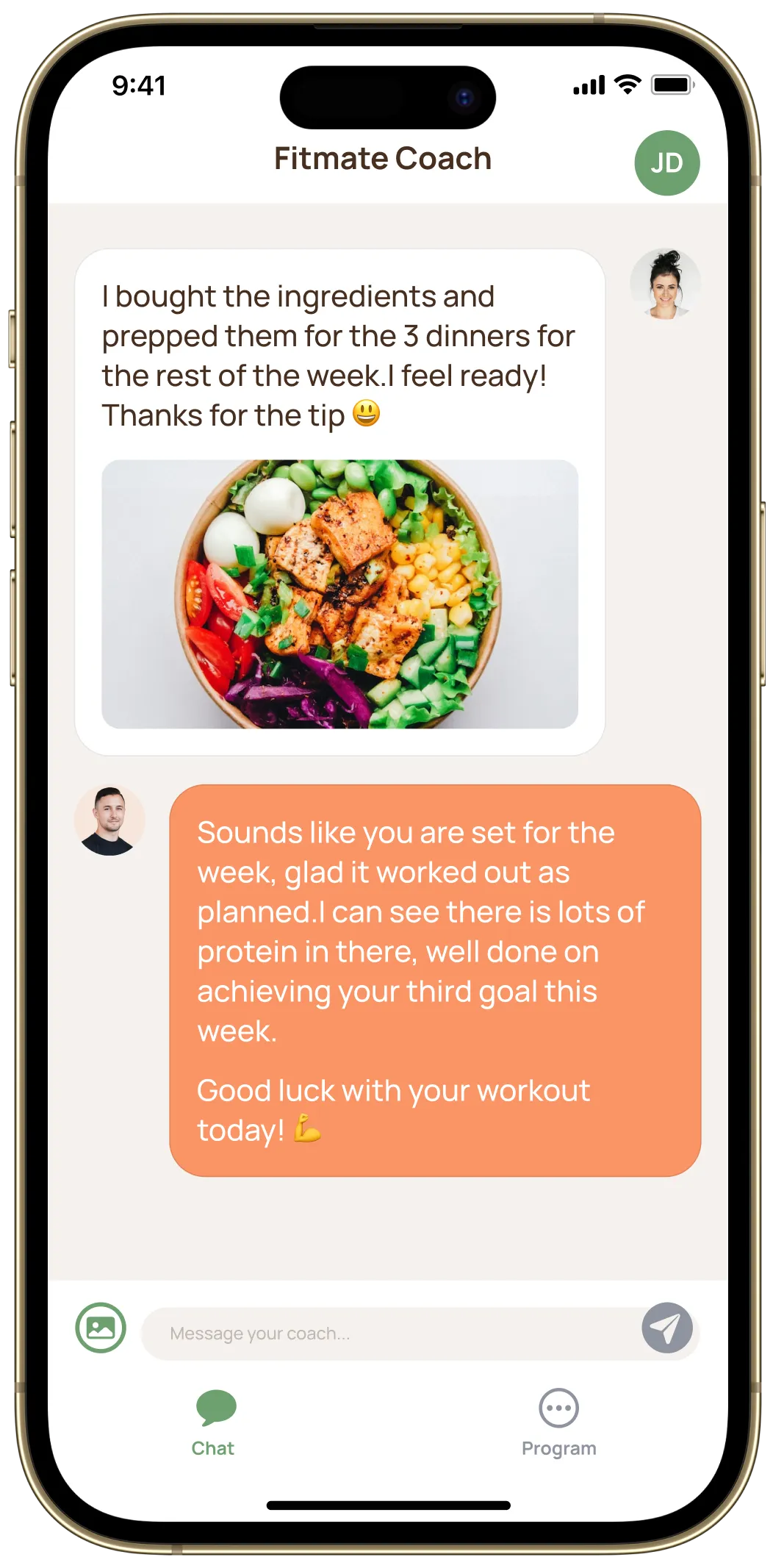 When you enroll, you get access to Fitmate’s dedicated messenger app where you can: